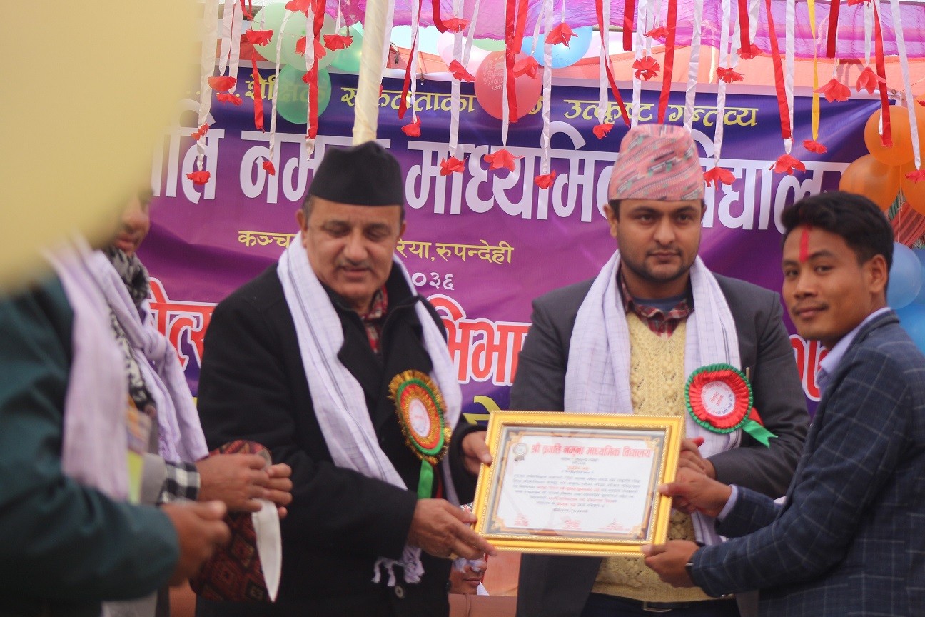 विद्यालयको बार्षिक उत्सवको अवसरमा विद्यालयमा अक्षयकोष स्थापन गर्न सहयोग गर्नु हुने अक्षयकोषदाताहरु प्रकाश गौतम, ठाकुर प्रसाद ज्ञवाली र पवित्रा कार्की, पुर्व प्रधानाध्यापकहरु बोम बहादुर थारु, हरिलाल शर्मा र जिवराज पौडेल, खेलकुद तथा अतिरिक्त कृयाकलापमा विद्यालयको सहभागितालाई उत्कृष्ट बनाउन अहम भुमिका खेल्नु हुने शिक्षकहरु जित बहादुर पुन, भुपाल बुढा मगर, हरिप्रसाद गौतम र एस ई ई २०७८ मा उत्कृष्ट ग्रेड लिइ उत्तिर्ण हुने विधार्थी आस्विन कंडेललाई सम्मान तथा प्रसंशा प्रत्र प्रदान गरिएको थियो। यस्तै अनुशासित तथा जेहेन्दार बिधार्थीहरुलाई छात्रबृत्ति तथा पुरस्कार समेत प्रदान गरिएको कार्यक्रममा विधार्थीहरुद्वारा विविध सांस्कृतिक झांकी सहितको नृत्य प्रस्तुत गरेका थिए।