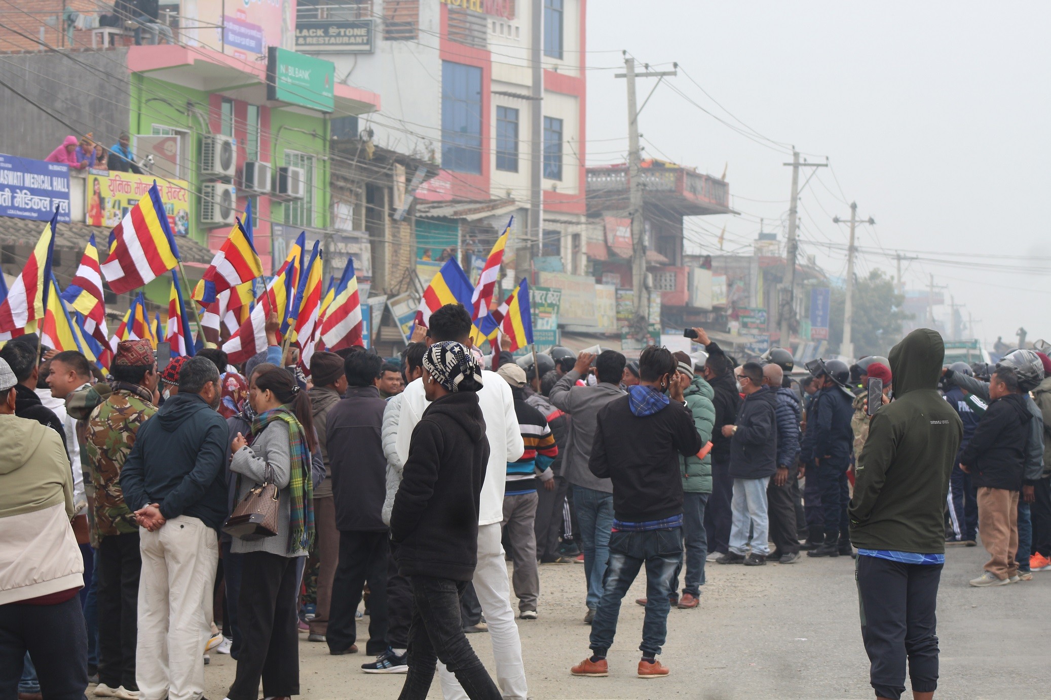 बौद्धमार्गीहरुले प्रदर्शन गरेको शान्तीपुर्ण र्याली तथा कोणसभालाई लक्षितगरी स्थानीयहरुद्वारा लट्ठी सहित प्रदर्शनमा उत्रिए पनि प्रहरी प्रशासनको कडा सुरक्षा व्यबस्थाकारण लुम्बिनीलाई दोहोरो भिडन्त हुनबाट जोगाइएको छ। दुबै तर्फको ढुंगा हानाहानका कारण केही सुरक्षाकर्मी र कञ्चन गाउपालिकाका अध्यक्ष नवराज ढकाललाई समेत सामान्य चोट लागेको छ।