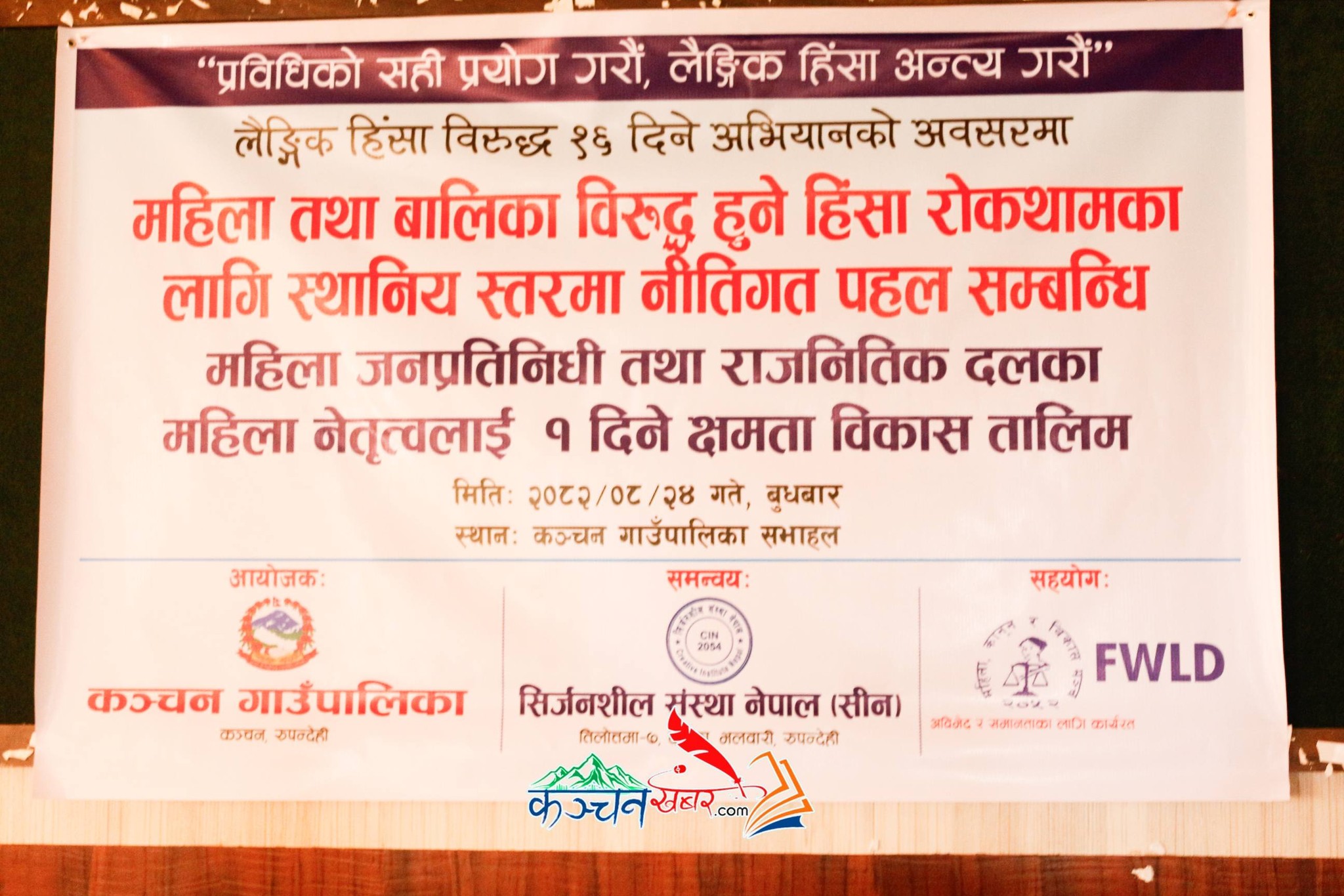 रुपन्देहीको कञ्चनमा महिला तथा बालिका विरुद्ध हुने हिंसा रोकथामका लागि स्थानिय स्तरमा नीतिगत पहल सम्बन्धि महिला जनप्रतिनिधी तथा राजनितिक दलका महिला नेतृत्वलाई १ दिने क्षमता विकास तालिम सम्पन्न भएको छ।