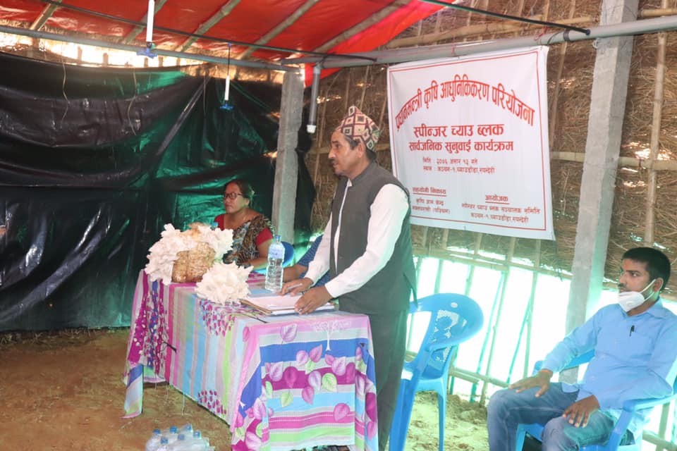प्रधानमन्त्री कृषि आधुनिकीकरण परियोजना स्पिन्जर च्याउ ब्लक,कञ्चन १,रुपन्देहीको आयोजनामा सार्बजनिक सुनुवाई कार्यक्रम सम्पन्न भएको छ । स्पिन्जर च्याउ ब्लक संचालक समिति,कञ्चन १,रुपन्देही र कृषि ज्ञान केन्द्र नवलपरासीको संयुक्त साझेदारी कार्यक्रममा संचालन भएको प्रधानमन्त्री कृषि आधुनिकरण परियोजनाको कार्य सम्पादन पश्चात स्पिन्जर च्याउ ब्लक संचालनको उद्धेश्य,लक्ष्य,लागत खर्च र आम्दानी,उत्पादन लक्ष्य लगायतबारे जानकारी गराउने उद्धेशयका साथ सार्बजनिक सुनुवाई कार्यक्रमको आयोजना गरिएको हो ।