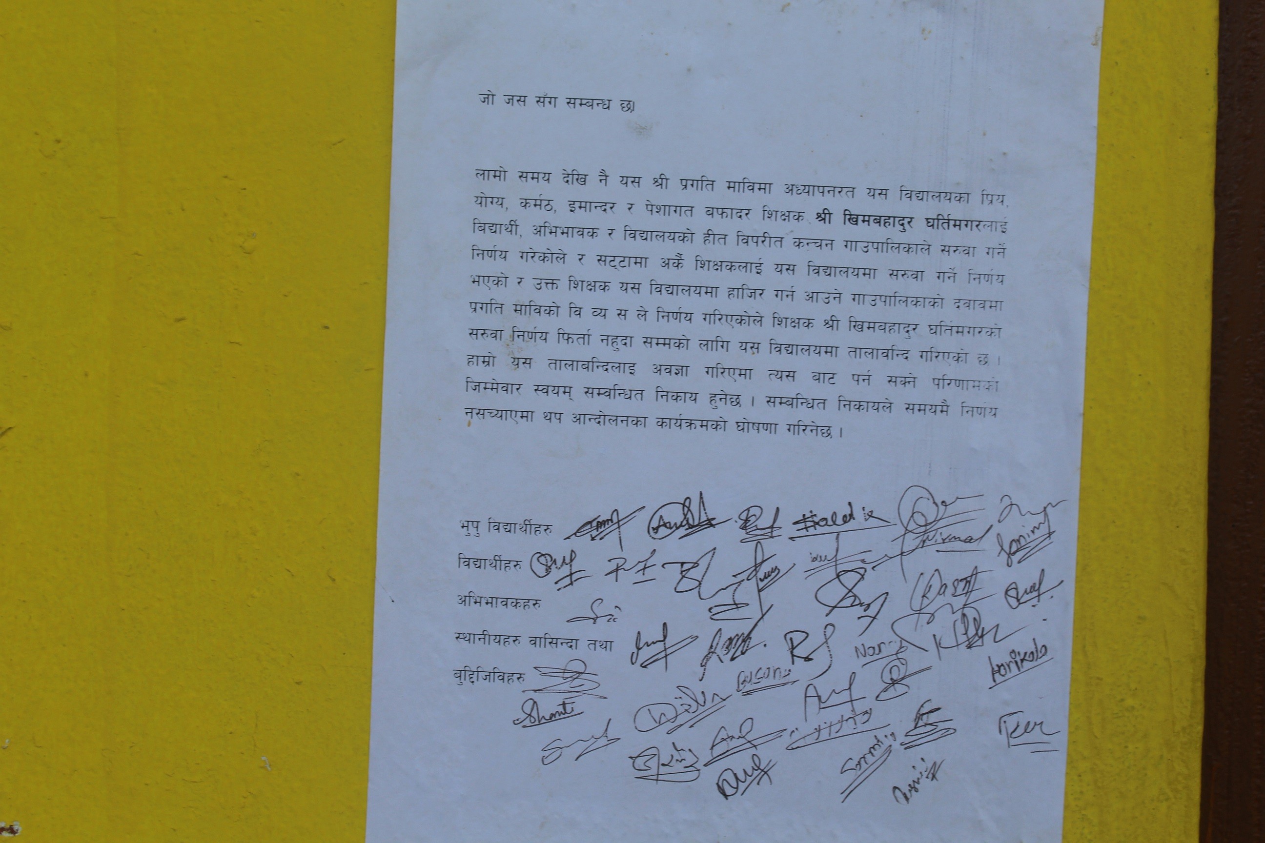 कागजमा शिक्षक सरुवा गर्ने गाउ शिक्षा समितिको सिफारिसमा गाउ कार्यपालिकाको निर्णय बिरुद्ध प्रगती माध्यमिक बिधालयमा बिधार्थी र अभिभावकहरुद्धारा गत साउन २५ गते बिधालयको प्रशासन शाखामा लगाइएको तालाबन्दी अझै खुल्न सकेको छैन ।